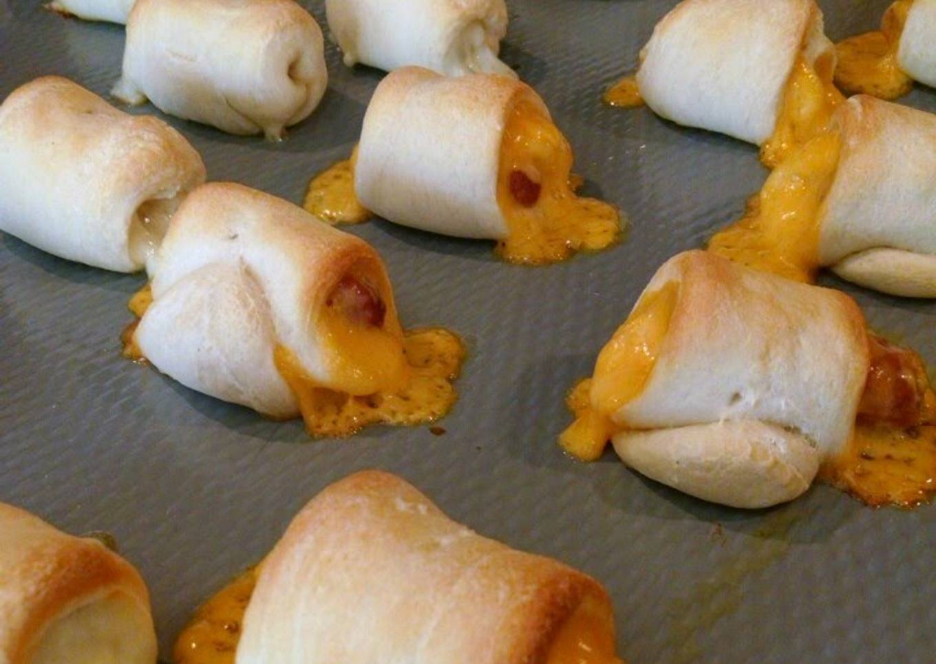 - Place biscuit strip on a nonstick pan, place a slice of cheese and a dog on the biscuit.