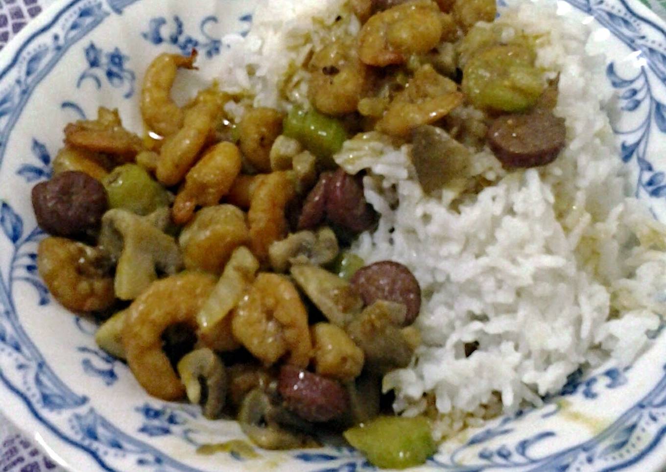 - add shrimp and hot dogs and cook until well done, add mushrooms and celery .
