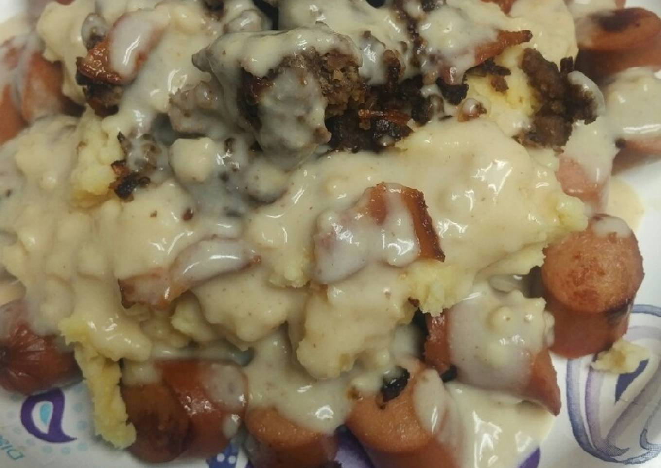 - Add some of the ground sirloin to the craters in the mashed potatoes and sprinkle with bacon pieces.