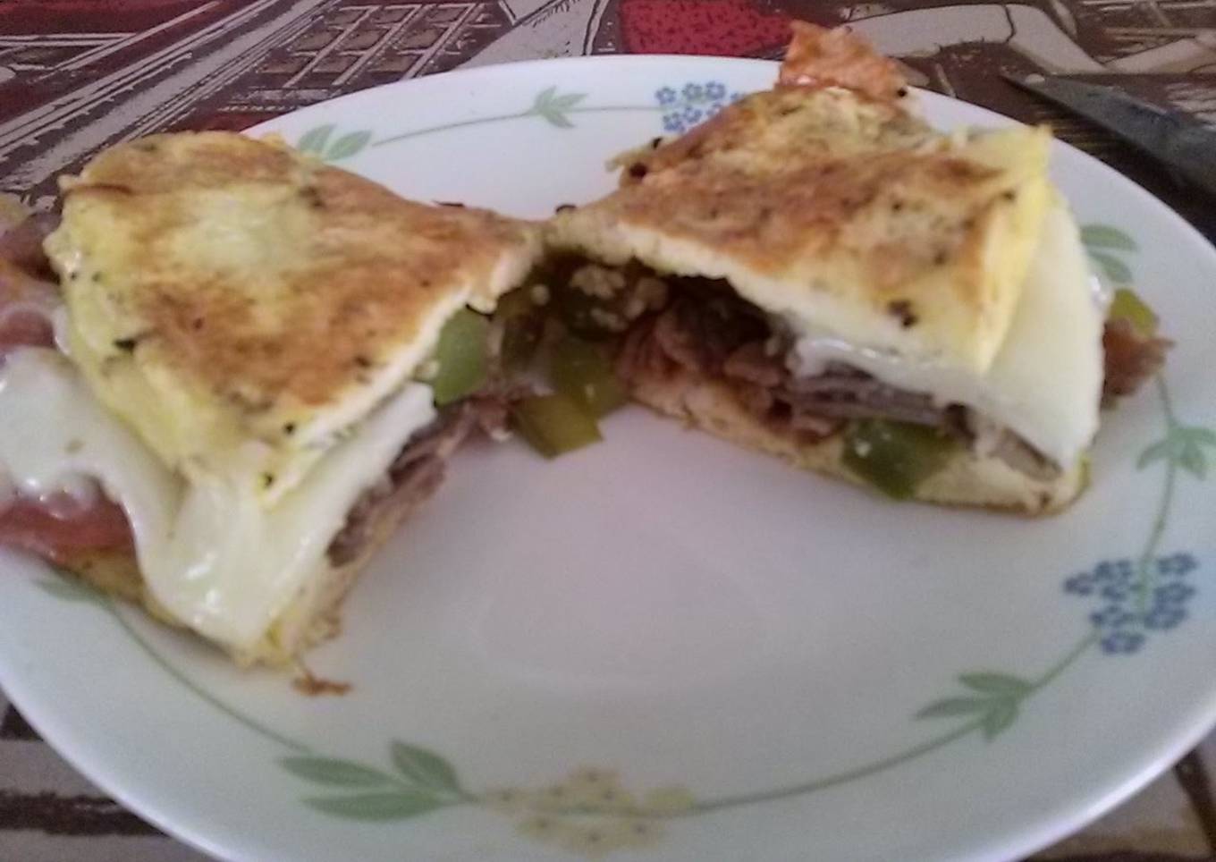 - Once cooked, put aside and cook eggs slowly. For best fluffy eggs, wisk eggs well. Once you flip egg, add cooked steak and peppers to top of egg.