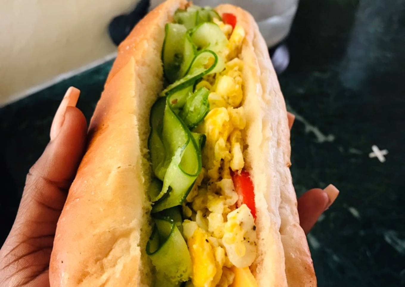 - To assemble the sandwich, gently pull open the bun and layer as desired with the tomato slices, cucumber shavings, and scrambled eggs.