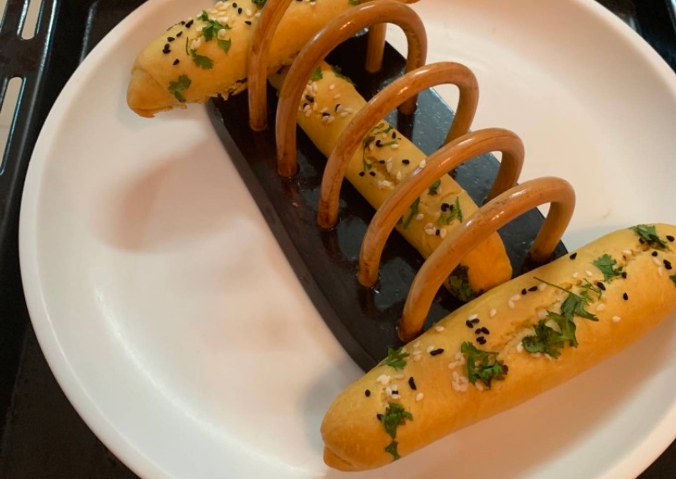- Lay the log on the baking tray and spread milk on it. Sprinkle kalonji seeds and sesame seeds on it. Then sprinkle coriander leaves. Sprinkle water on the baking tray, so that hot dog does not get dry.