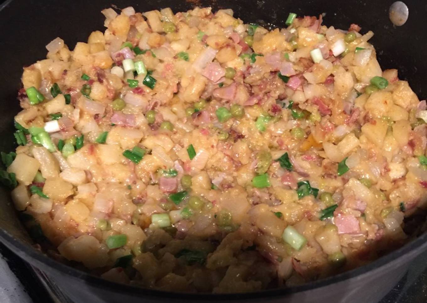 - Then add the hash browns, chopped ham, chopped American cheese, bacon & peas. Stir till cheese is melted.